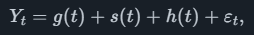 where g(t) describes the linear trend, s(t) describes various seasonal patterns and h(t) incorporates holiday effects. The final term εtεt is the error term which is not described by the model.