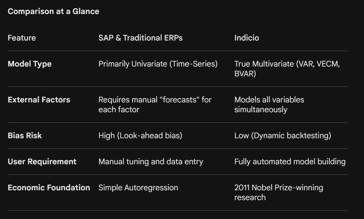 Il passaggio da univariato a previsione multivariata rappresenta il più grande balzo in termini di precisione predittiva negli ultimi 50 anni. A differenza dell'approccio di SAP, i modelli multivariati trattano l'intero ecosistema, le vendite, le tendenze di mercato e gli indicatori economici come un unico sistema interconnesso.